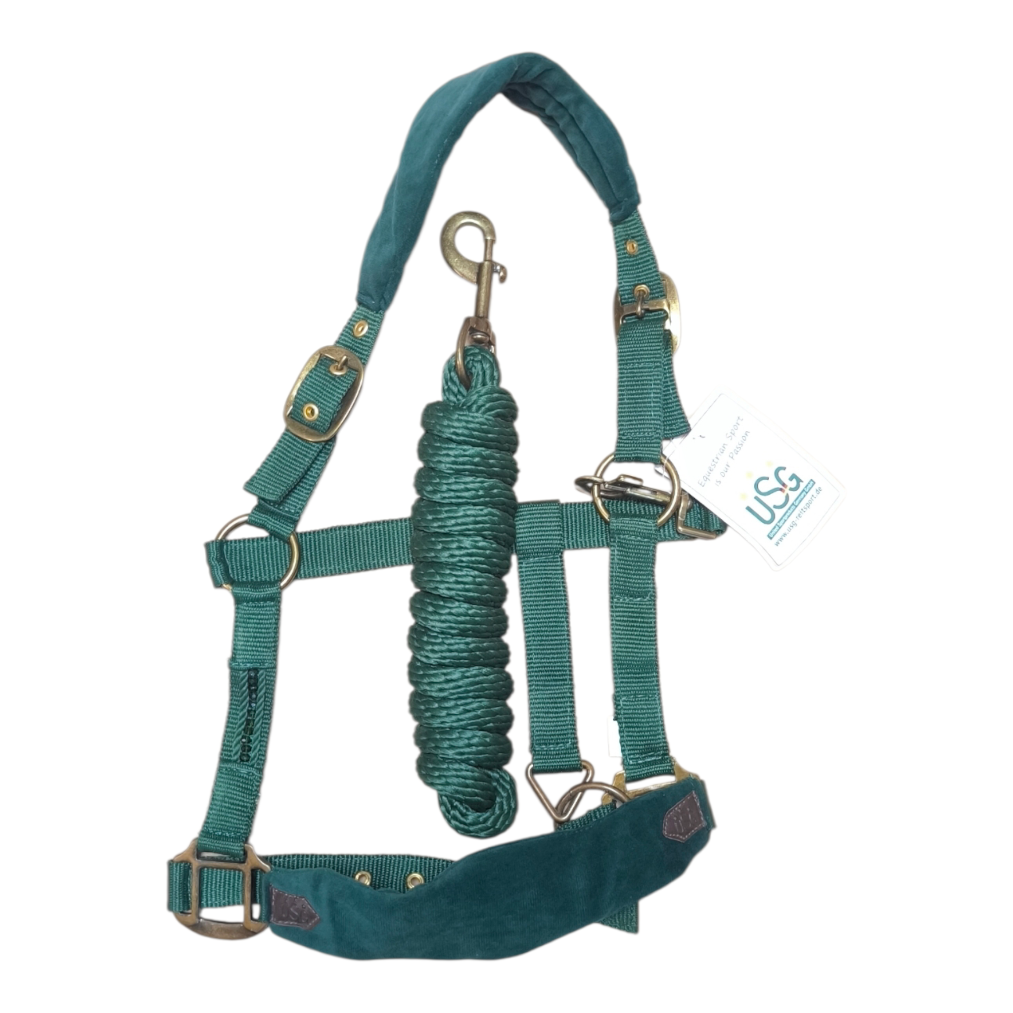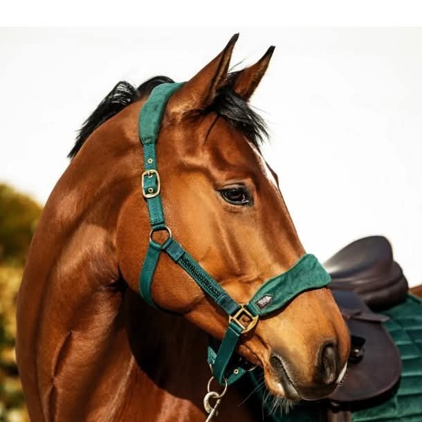 Halfter Set mit Perlenschmuck auf den Backenstücken und einem breitem Nasen und Genickstück aus Mikrofasersamt.